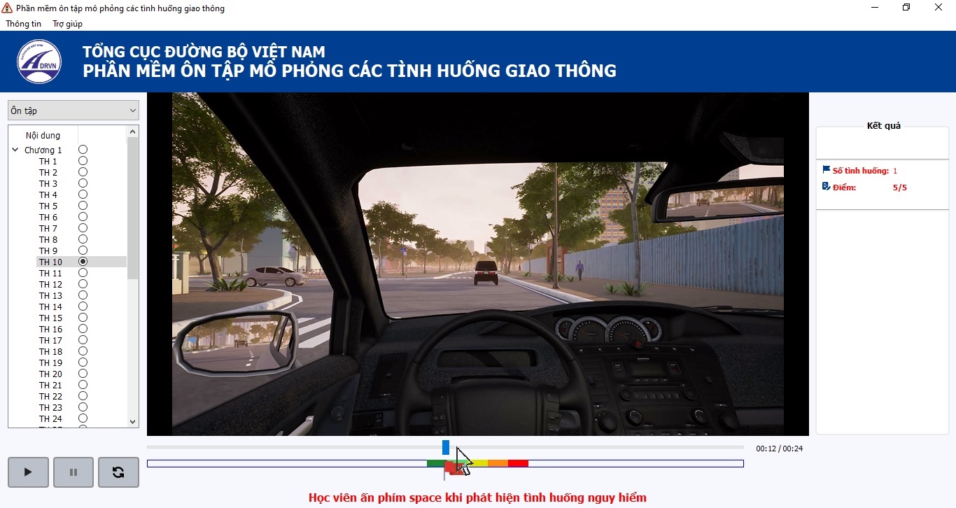 2/ Ghi chú: Khi luyện tập gặp những tình huống khó, HV để tình huống chạy & click “Space” xác định vị trí cắm cờ. Sau khi hết, tình huống sẽ hiển thị vị trí click “Space” & các thang điểm, HV di chuyển chuột máy tính kéo nút chạy về số điểm mong muốn & hãy ghi nhớ tình huống đó để luyện tập.